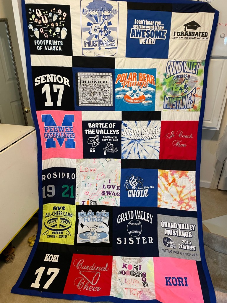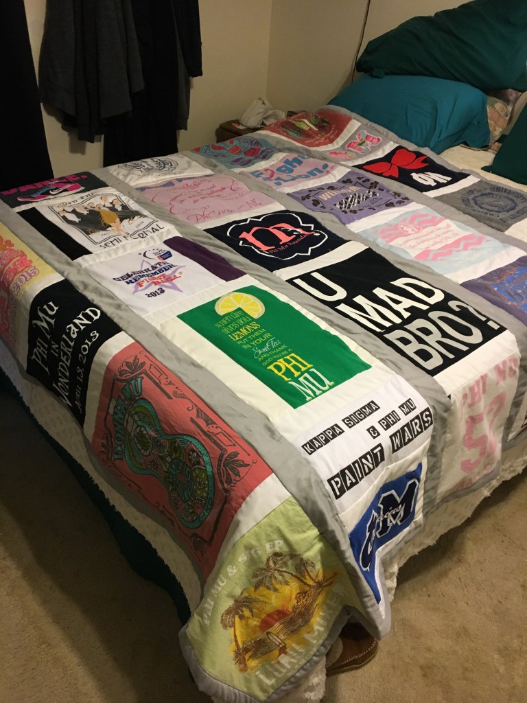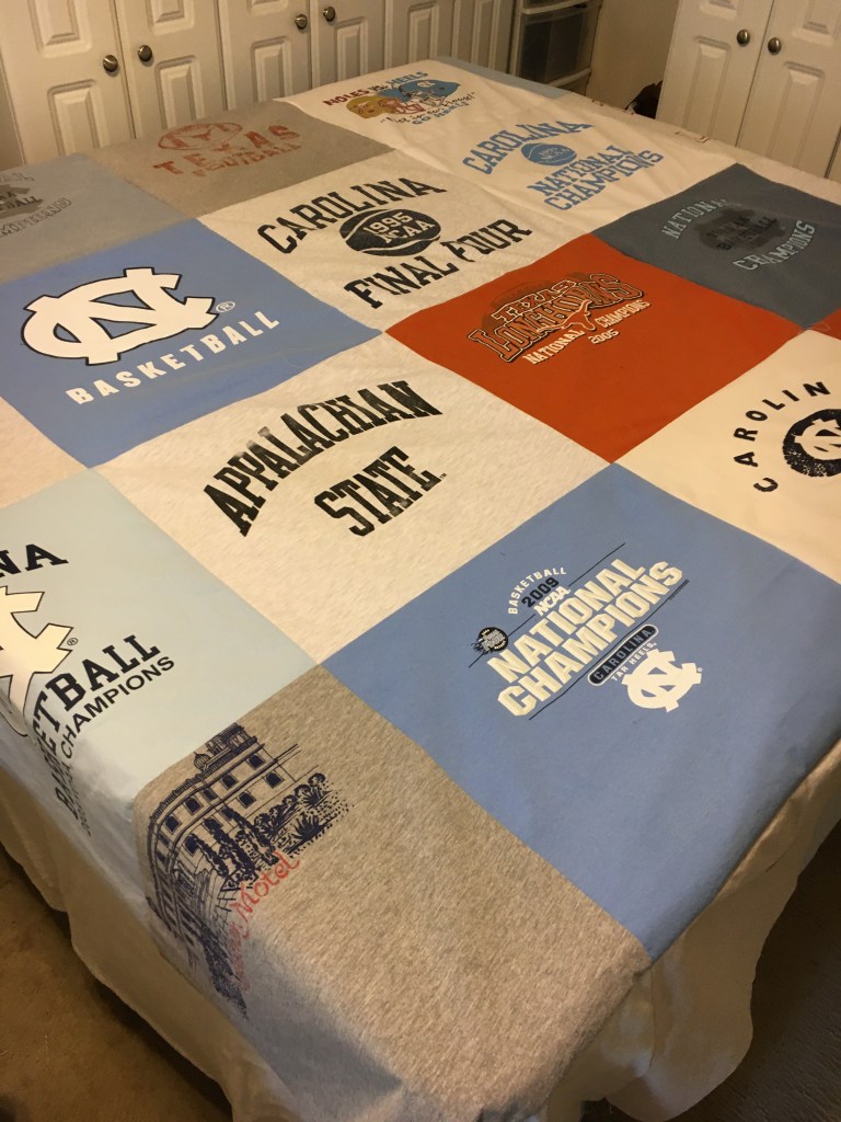 I cut each T-shirt block 16×20 so, after stitching, the quilt measures 72×98”.