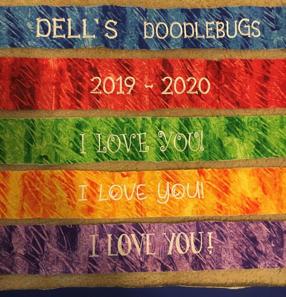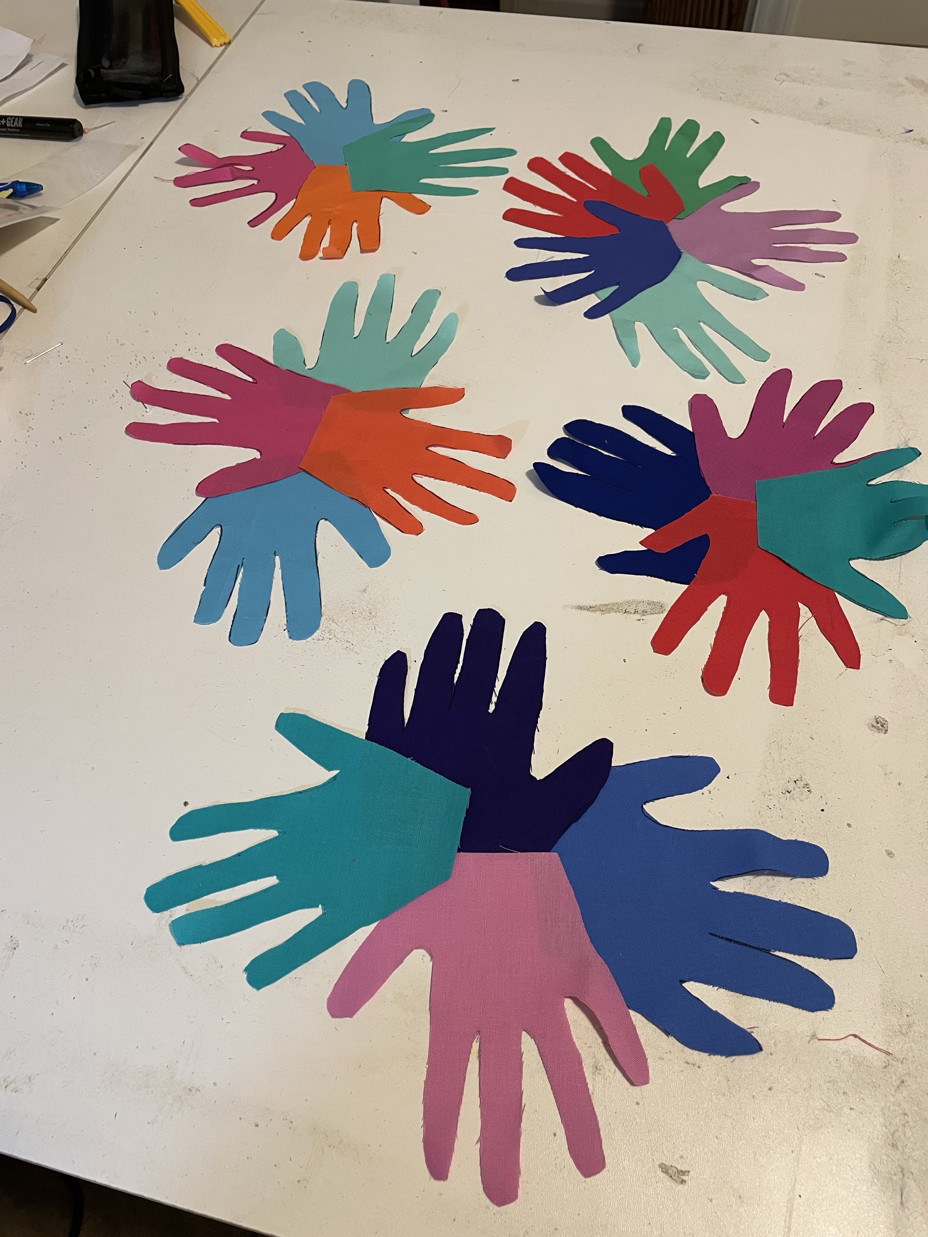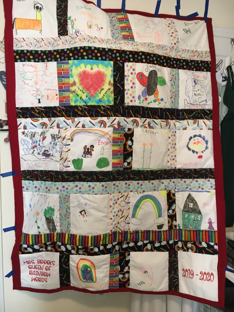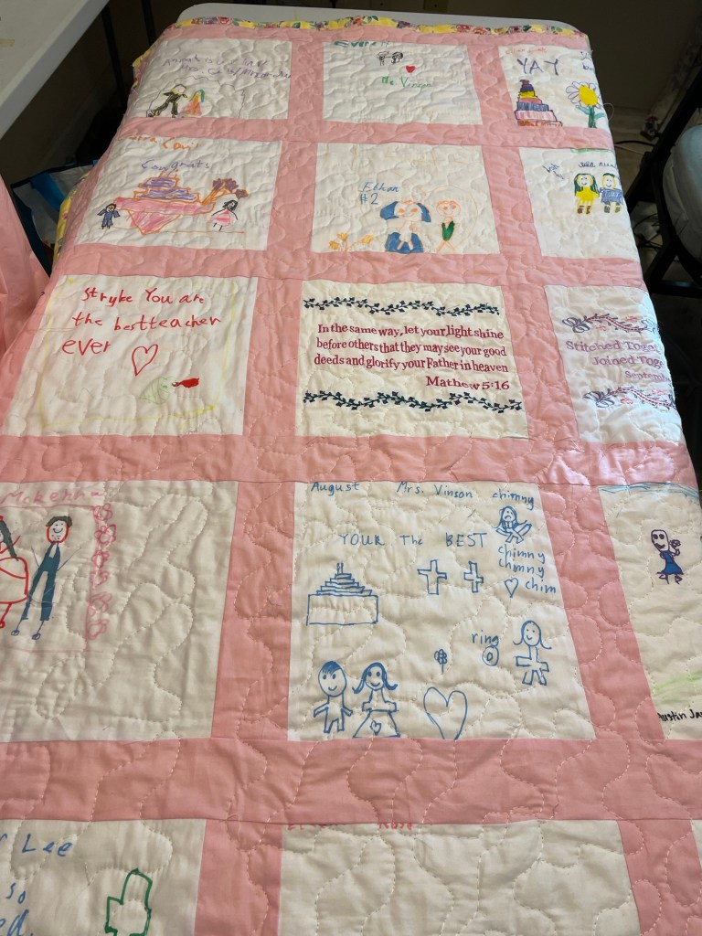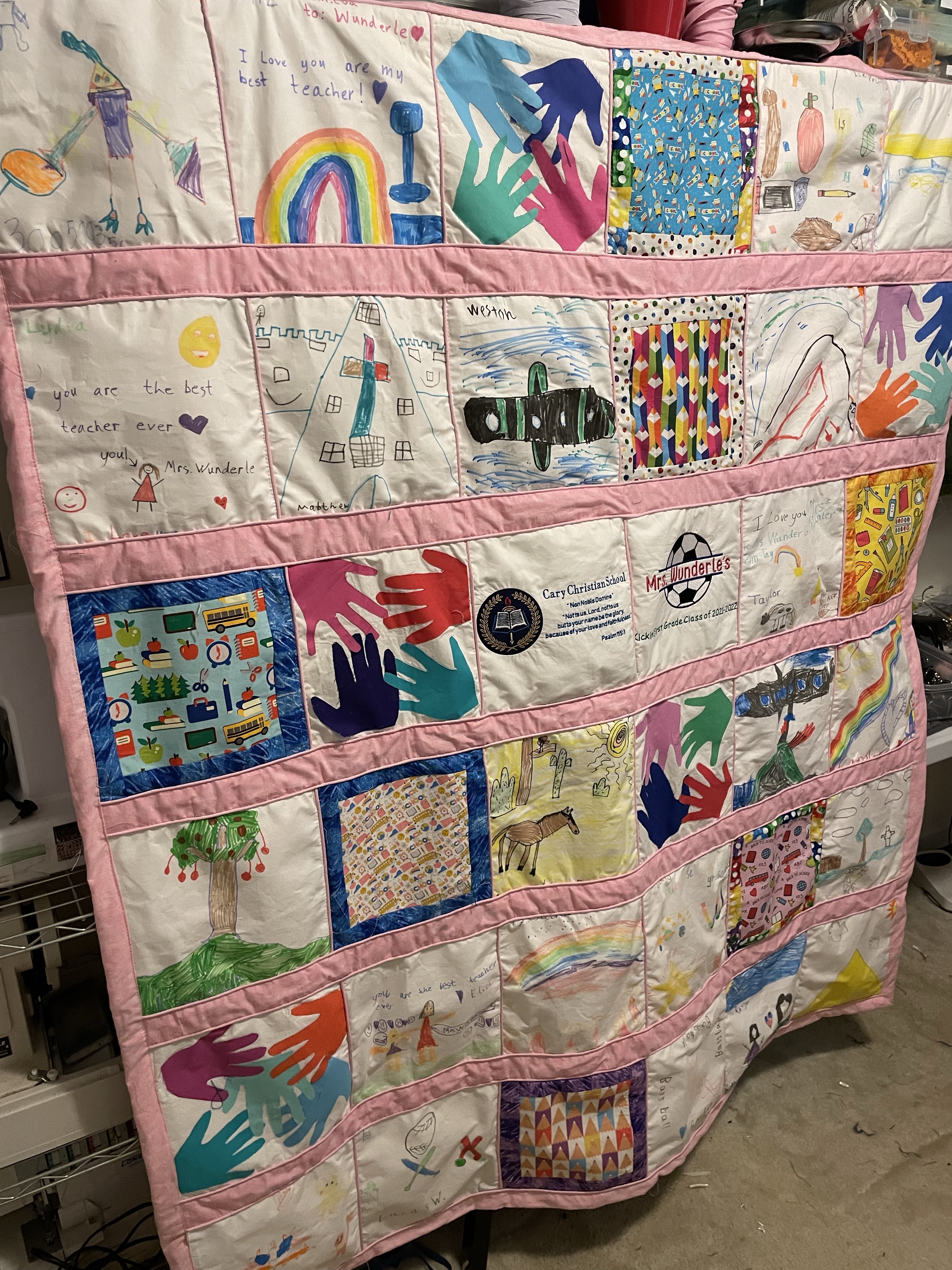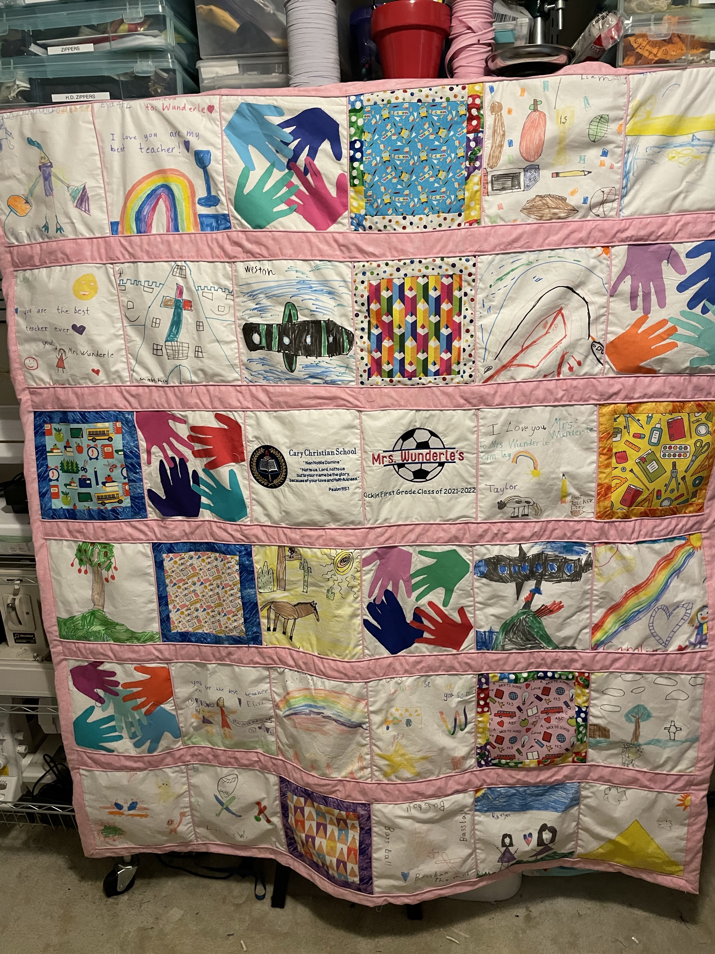 This is a “piping quilt”. I added piping because most of the blocks are white and the pink piping adds additional color. The students each drew around one of their hands and drew a picture to be used as one of the blocks.