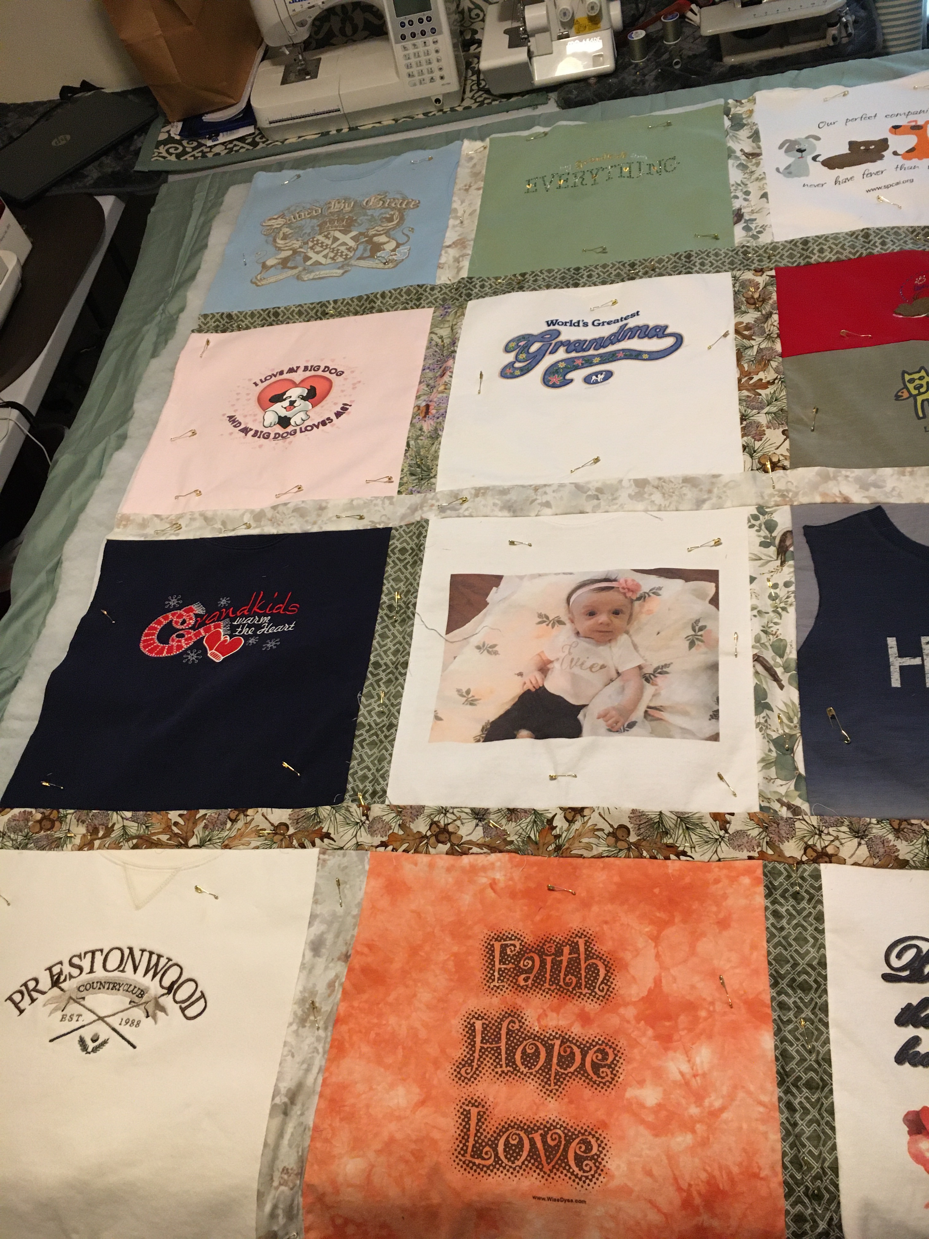 My client had only a few shirts so I used a 15” square template for cutting and added 2” fabric strips between each block. The quilt finished out at 48” X 62”. Perfect throw size quilt