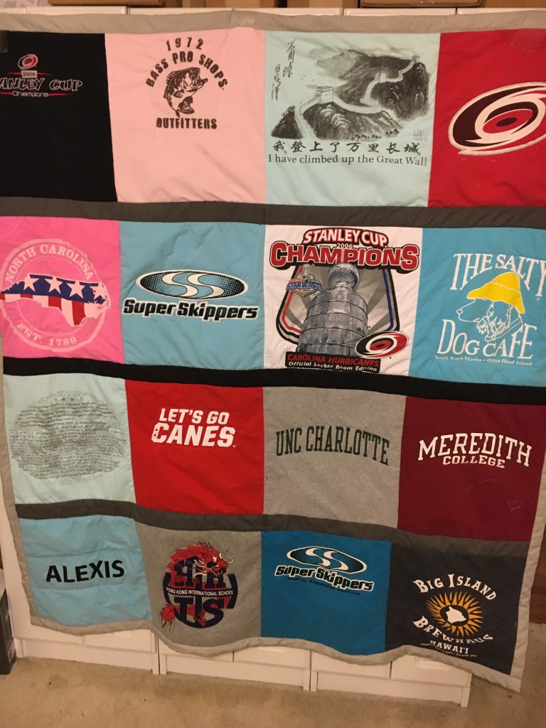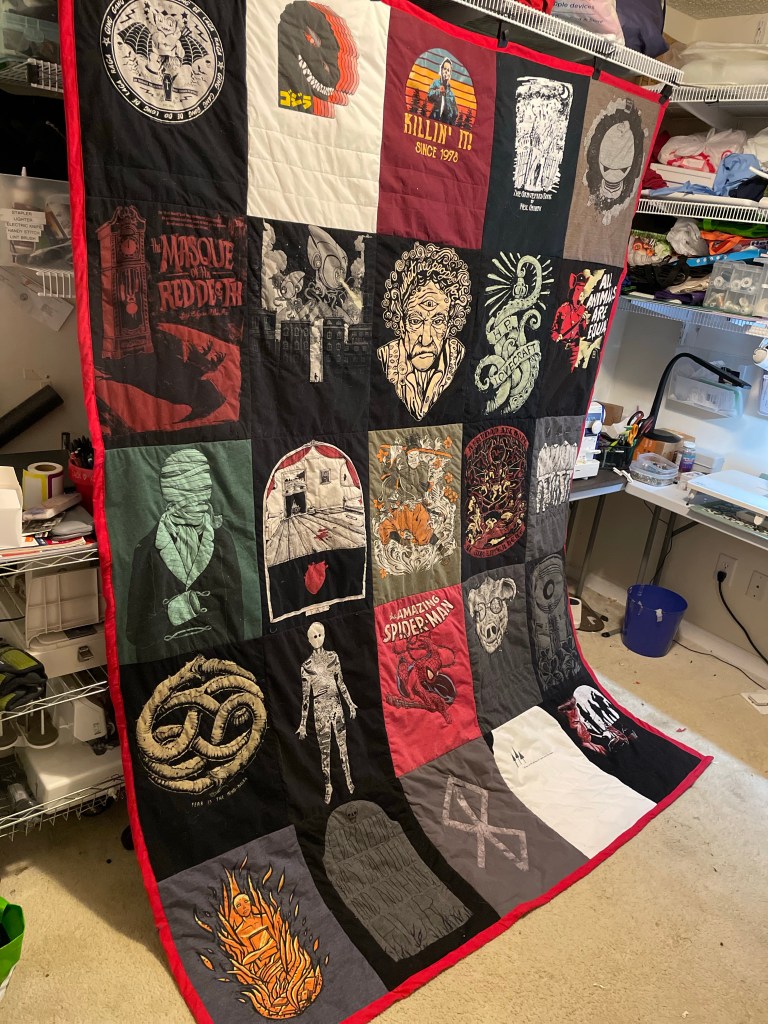 Here’s a queen size “t-shirt block to t-shirt block quilt. Too big to get in a single shot.