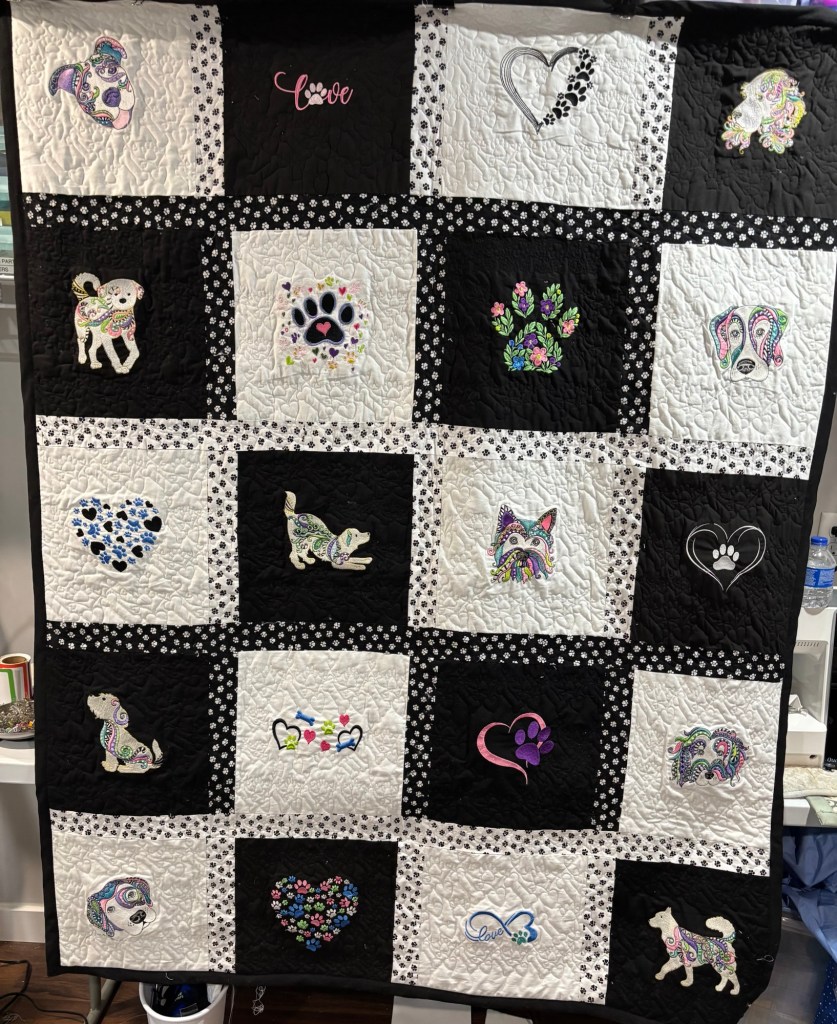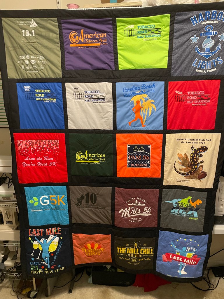This was a fun quilt to make. My client loves to run and didn’t let Covid stop her. On 10-31-2020 she ran the “Pam 5k” – a race she planned herself. To commemorate, I