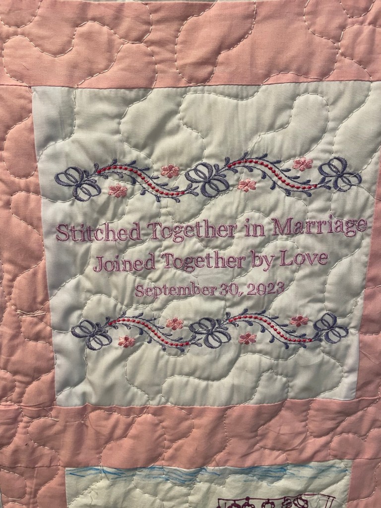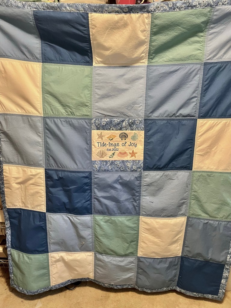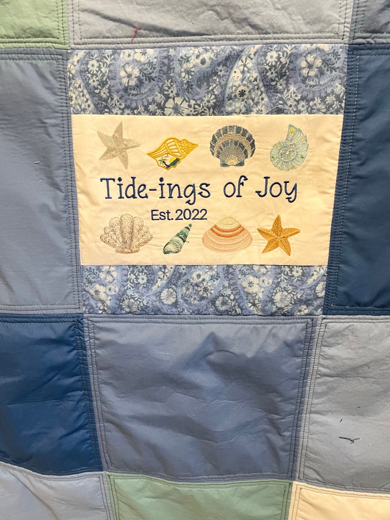 My clients recently purchased a vacation beach house rental and asked that I design/make a quilt to be used in lieu of a guest book. They named the property “Tide-ings of Joy”. There’s room for lots of guests to sign. What fun!
